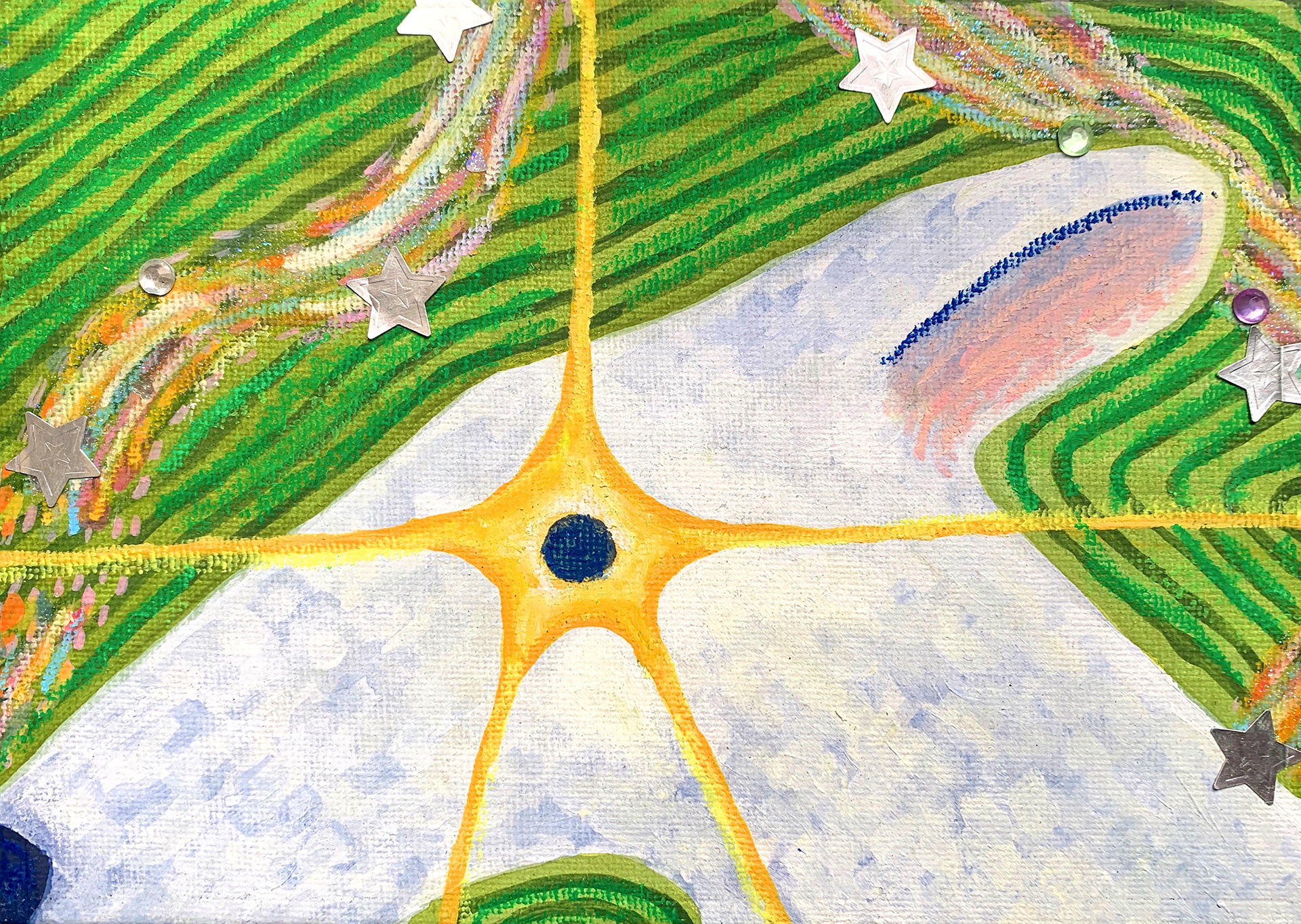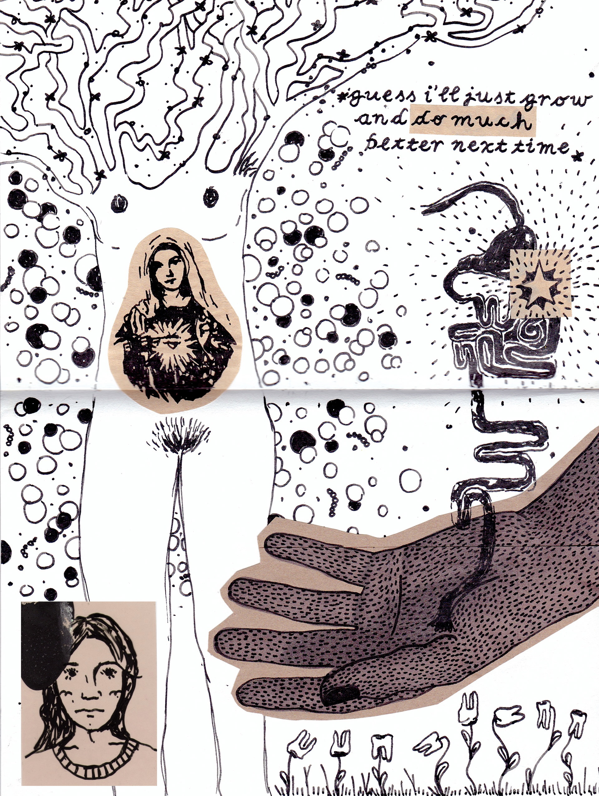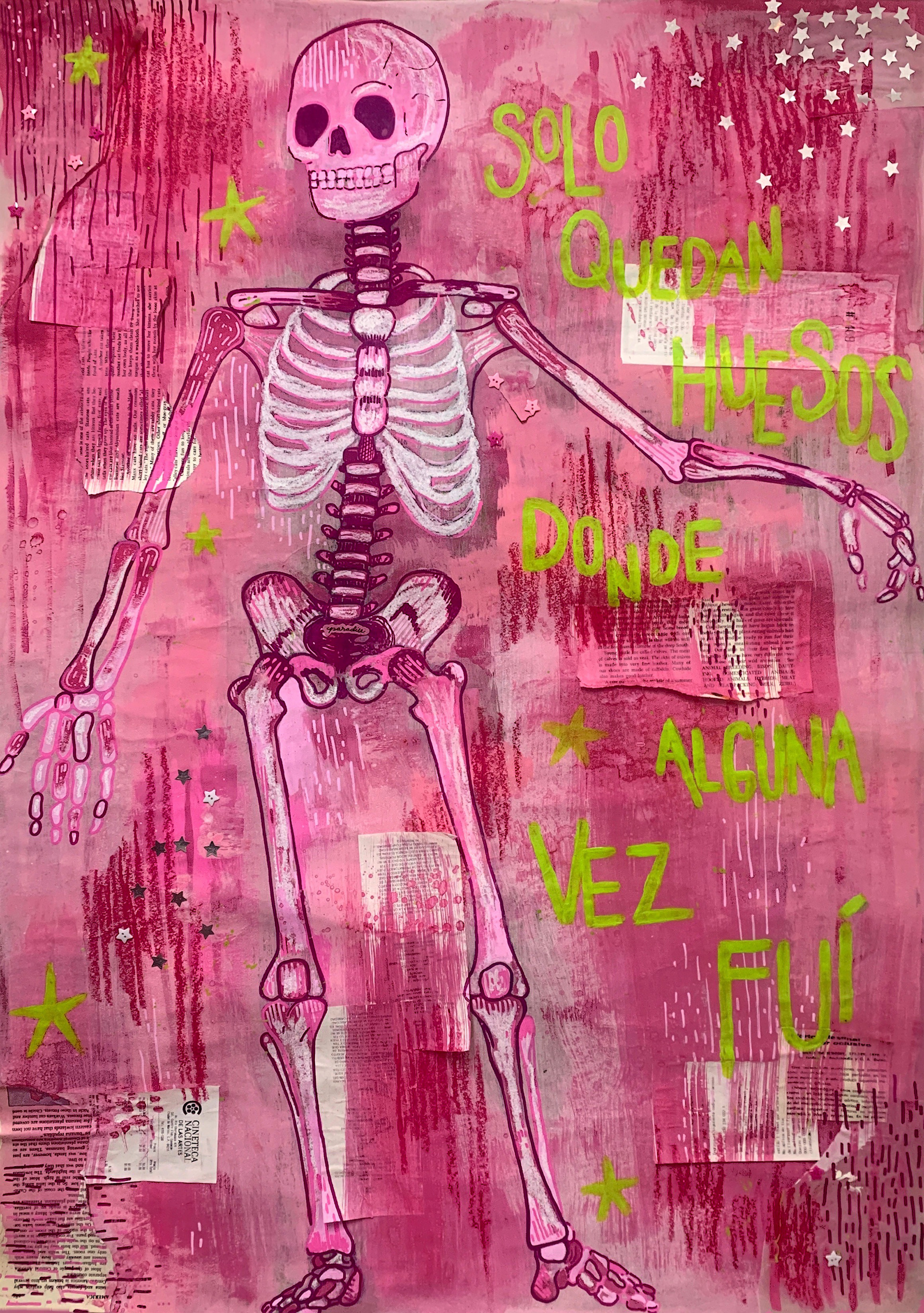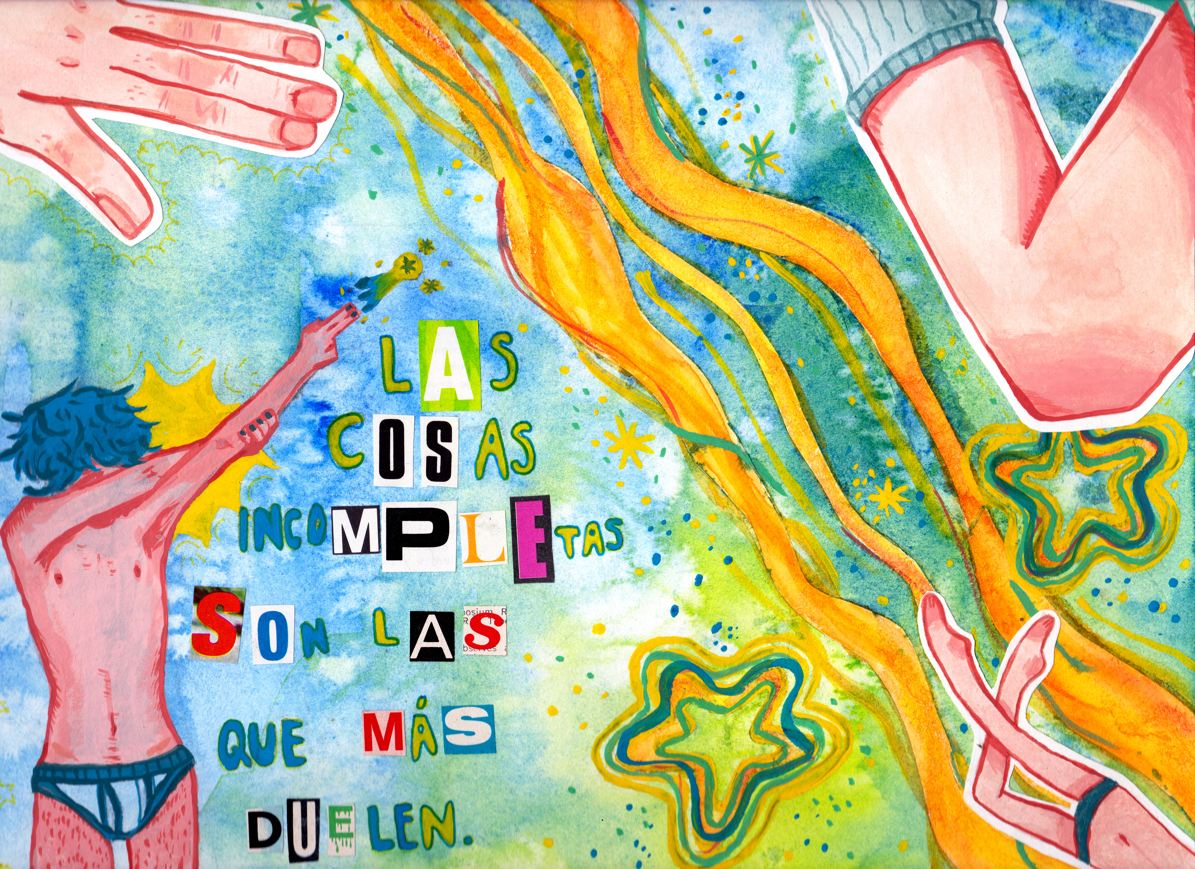 acrílico, pasteles de oleo, plumón de acrílico, estampas, recortes sobre papel kraft